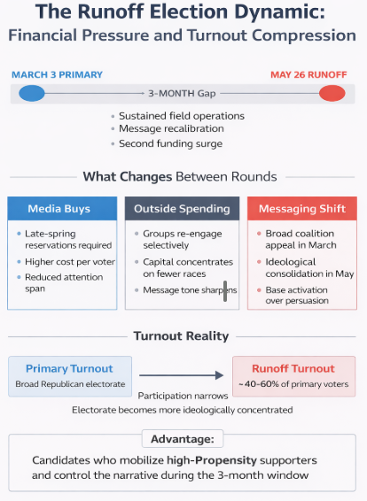 Once the field narrows, the race resets. The runoff is not a continuation of March. It is a second election with a different electorate. Turnout drops, often significantly, and the voter pool becomes smaller, older, and more ideologically committed. Casual primary voters frequently do not return. Campaigns must therefore shift from broad persuasion to targeted mobilization.