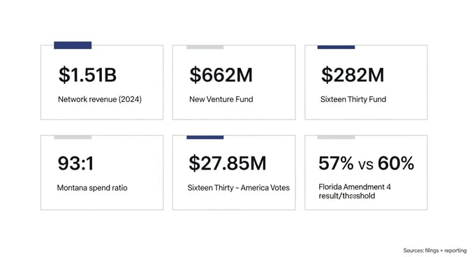 - Florida’s Near Miss: The network funneled $14 million (part of a reported $23.5 million total contribution) into Floridians Protecting Freedom, helping the measure win 57% but fall short of the 60% threshold.