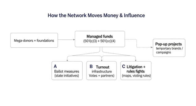 The network did not limit itself to ballot issues and turnout. It also funded legal activism and political hardball designed to shape the terrain of elections.