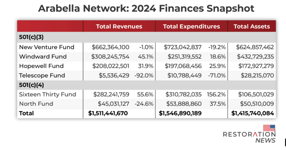 - $1.5 Billion Spend: The Arabella network’s collective revenue across its 501(c)(3) and (c)(4) funds topped $1.5 billion in the 2024 election year.