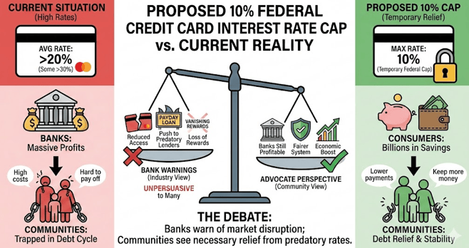 The proposal would impose a temporary federal cap on credit card interest rates at 10%, a dramatic reduction from current average rates that often exceed 20%. Banks have warned that such a cap would restrict credit availability and disrupt lending markets. Those arguments are familiar and, in many working-class communities, largely unpersuasive.