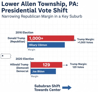 Those changes are visible in the surrounding suburbs. The Philadelphia Inquirer notes that townships near Harrisburg, including Lower Allen, have steadily trended leftward. Donald Trump carried Lower Allen by more than 1,000 votes in 2016, but by only 129 in 2020, illustrating a broader suburban shift toward the center.