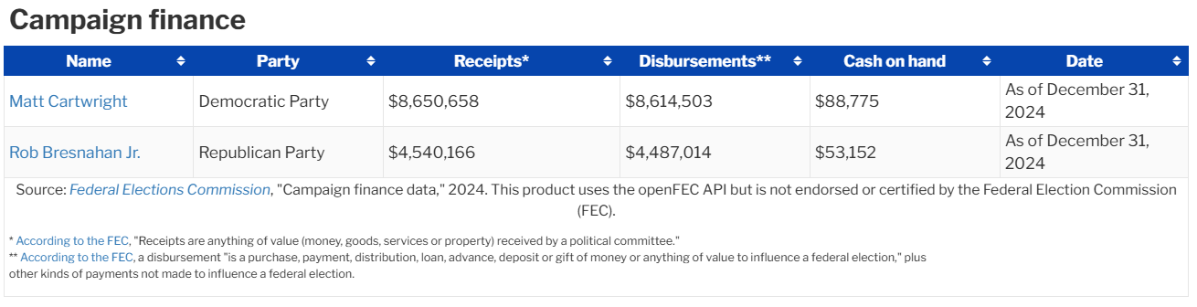 Campaign finance reports illustrate how uneven the financial landscape was in PA-07. According to the Federal Election Commission, Susan Wild entered the race with a commanding fundraising advantage, reporting $8,960,928 in receipts and $8,946,230 in disbursements by the end of 2024.