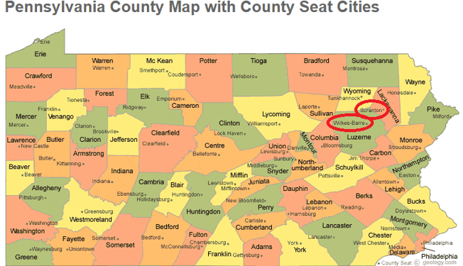 Screenshot of PA County Map and County Seat Cities from Geology; red circles added for emphasis.