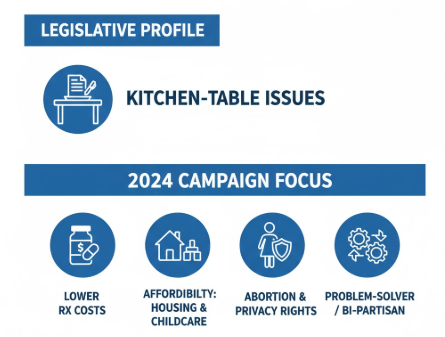 McDonald Rivet entered Congress with a profile built in the state Senate, where she emphasized practical, kitchen-table issues. In the 2024 campaign, she focused on lowering prescription drug costs, addressing housing and childcare affordability, and protecting abortion and medical privacy, positioning herself as a problem-solver willing to work across the aisle.