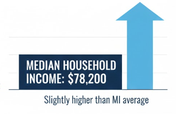 The median household income is about $78,200, slightly higher than the Michigan average, and manufacturing-intensive communities make up a core part of the local economy.