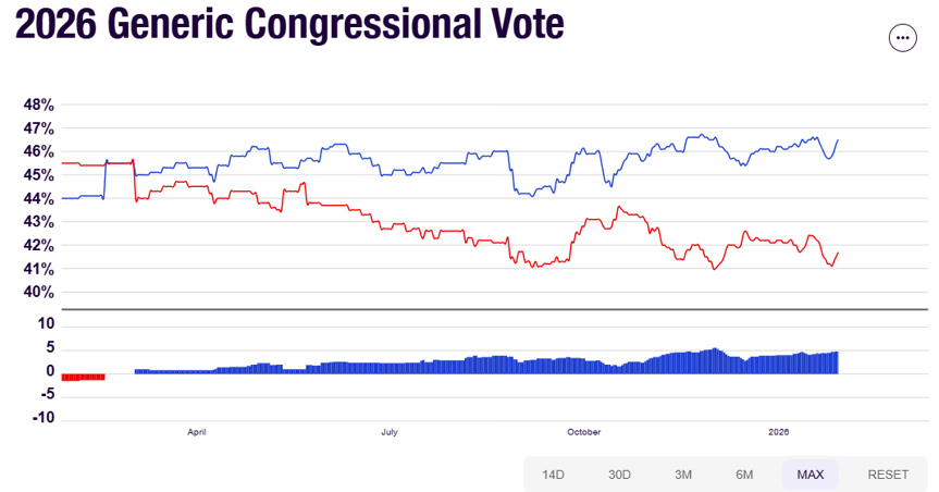 “The Generic Ballot polling average tracks whether voters prefer a ‘generic’ Democrat or a ‘generic’ Republican. It’s often treated as a rough snapshot of the national popular vote in congressional elections.”