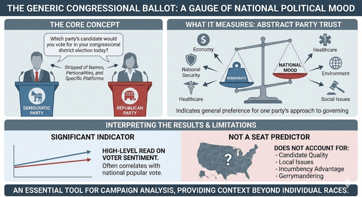The generic congressional ballot has become one of the most closely watched indicators in modern campaign analysis, not because it predicts seat outcomes directly, but because it offers a high-level read on national mood. By stripping away candidate-specific variables, the generic ballot captures something more elemental: which party voters trust more, in the abstract, to govern Congress.