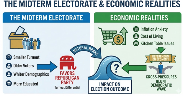 - A Democratic surge is naturally constrained because midterm elections activate a distinct and more conservative electorate.