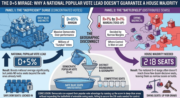 There is also a composition problem embedded in the D+5 number itself. National leads are frequently driven by overwhelming Democratic margins in deep-blue districts rather than meaningful movement in the smaller set of swing seats that actually decide House control. Democrats can expand their popular vote advantage without expanding the battlefield.