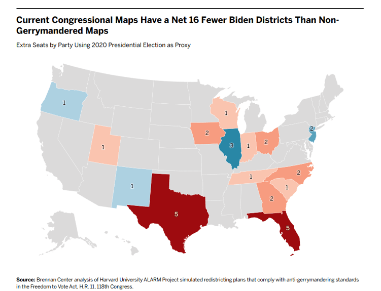 In practical terms, this creates a structural bias. Multiple Brennan Center analyses have found that Democrats must often win the national popular vote by several points just to approach parity in House seats. Even when both parties gerrymander, the net effect still tilts toward Republicans because of how Democratic voters are geographically concentrated and how efficiently Republican voters are distributed across districts.