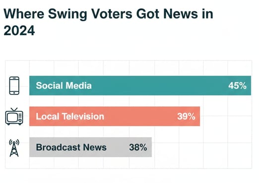 This shift is quantifiable: in 2024, swing voters were significantly more likely to rely on social media (45%) for news than on local television (39%) or broadcast news (38%).