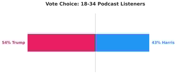 - Among registered voters who listen to podcasts, 50% said the medium influenced their vote in 2024; among listeners aged 18–34, the split favored Trump (54% vs. 43%).