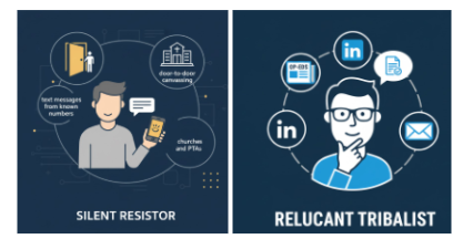 Similarly, the Reluctant Tribalist resists outrage. They want "permission" to vote for a candidate. They require a "calm, rational, competent" tone that avoids sarcasm. They are reached through intellectual or professional channels like op-eds, LinkedIn, and long-form email newsletters.