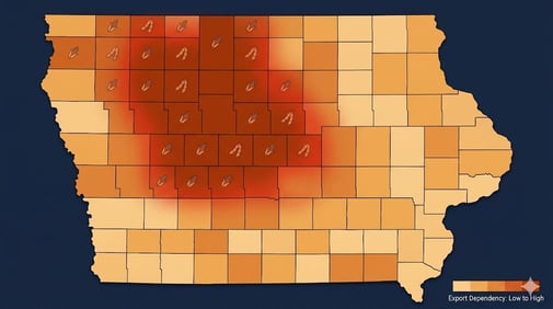 Campaign Now (Gemini), Iowa county map showing corn and soybean export dependency by county, with trade impact overlay