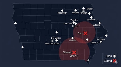 The One Big Beautiful Bill Act is not a budget line in Iowa. It is the reason patients in Ottumwa are now driving up to an hour to reach medical care. MercyOne, which operates 21 medical facilities across Iowa, closed its Ottumwa and Traer locations and reduced staff in Des Moines and Mason City after the bill cut Trinity Health's projected annual revenue by $1.5 billion.