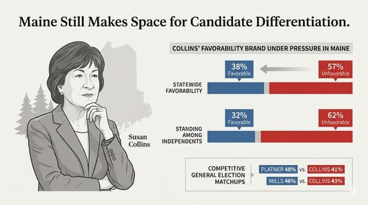 The core problem for Susan Collins is that her old crossover formula looks weaker than it once did. The survey found her with a 57% unfavorable rating statewide, and with independents she was even deeper underwater, at 32% favorable to 62% unfavorable. That is the kind of number that turns a brand advantage into a turnout and persuasion liability.