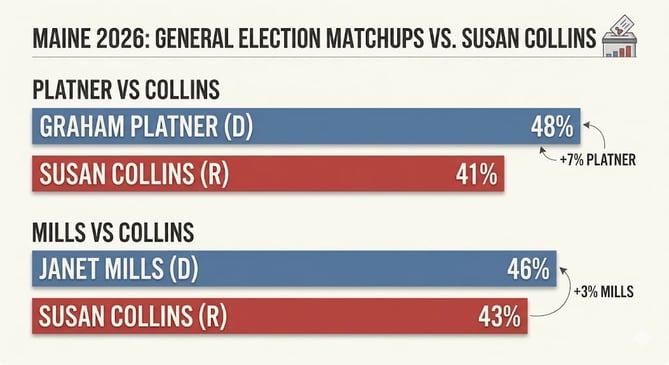 - In the general election tests, Platner led Susan Collins 48% to 41%, while Mills led Collins 46% to 43%.