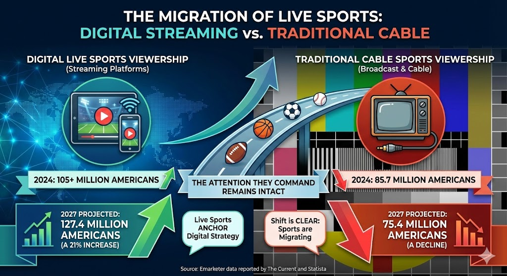 Live sports no longer sit apart from digital strategy. They anchor it. According to Emarketer data reported by The Current and Statista, more than 105 million Americans watched live sports digitally in 2024, surpassing traditional cable viewership at 85.7 million. By 2027, digital live sports audiences are projected to reach 127.4 million, a 21% increase, while cable sports viewership is expected to fall to 75.4 million.