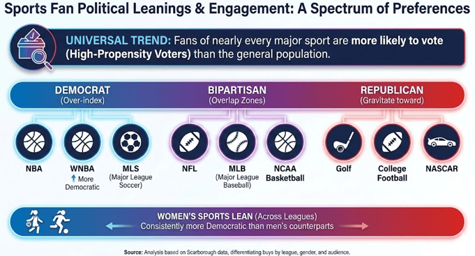 The NFL, Major League Baseball, and NCAA basketball remain broadly bipartisan, functioning as political overlap zones where campaigns can reach high-propensity voters from both parties at once. That overlap is especially valuable because Scarborough data also shows fans of nearly every major sport are more likely to vote than the general population, making sports media a reliable channel for reaching engaged voters rather than low-attention audiences.