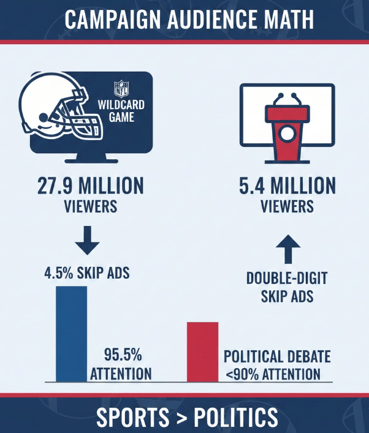 On the voter side, campaigns follow the audience math. Sports broadcasts deliver massive, attentive viewership that political programming cannot match. An NFL wild-card game drawing 27.9 million viewers dwarfed a same-night Republican primary debate with just 5.4 million viewers. Only 4.5 % of viewers skip ads during live sports, compared to double-digit skip rates elsewhere.