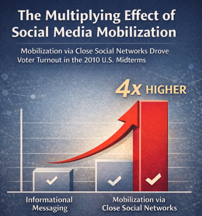 Research on social media and political mobilization shows that influence now compounds through repetition and network effects rather than persuasion alone. For example, during the 2010 U.S. midterms, mobilization messages delivered through close social ties on Facebook were four times more effective at increasing validated voter turnout than informational messages or controls, underscoring how scale and social reinforcement outperform traditional outreach.