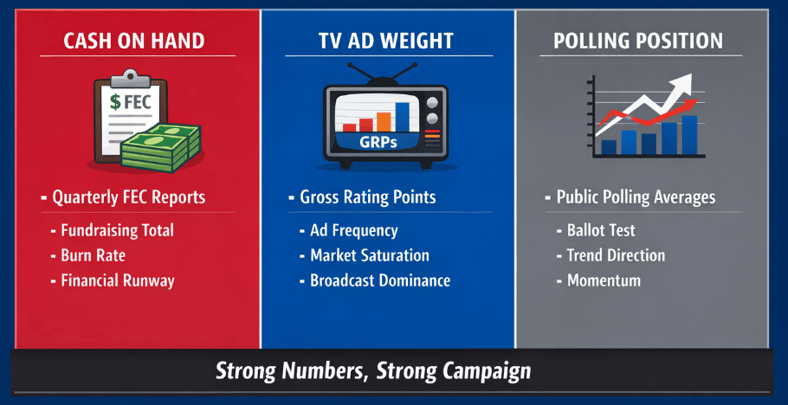 The health and trajectory of a political campaign were judged by a simple, familiar scoreboard, where a candidate’s strength could be quickly assessed through three key metrics: the cash on hand reported in quarterly FEC filings, the weight of their television ad buy measured in Gross Rating Points, and their standing in the latest public polling.