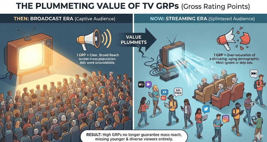 A high GRP score no longer guarantees mass reach; it may only prove that a campaign is over-saturating a shrinking and aging demographic that still watches linear television, while completely missing younger and more diverse voters.