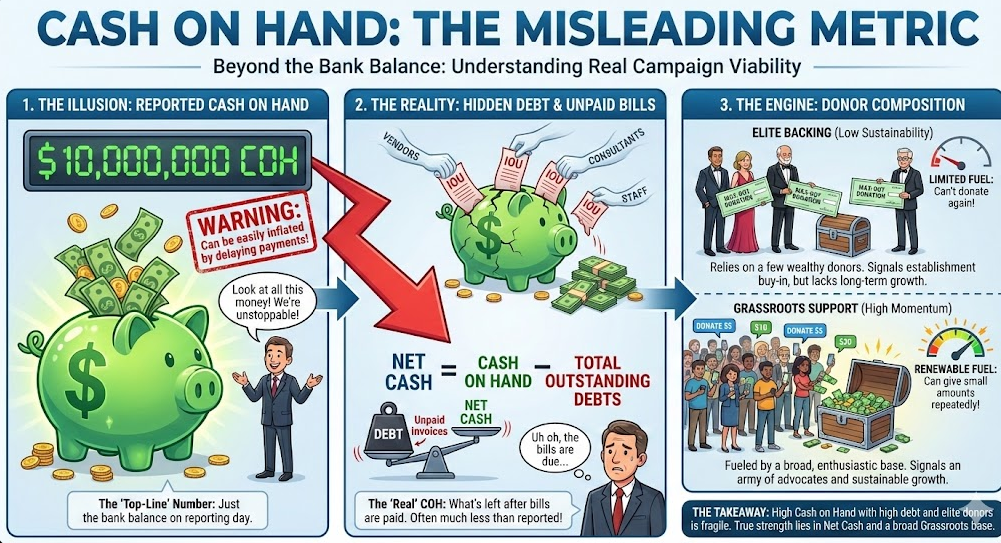 Cash on hand, once seen as the ultimate measure of a campaign’s viability, has become a misleading figure. A large balance can be easily inflated by simply delaying payments to vendors and consultants, creating an illusion of financial health that crumbles after the next reporting period. More importantly, a top-line number fails to distinguish between a campaign propped up by a few wealthy, max-out donors and one fueled by a broad, enthusiastic base of grassroots supporters.