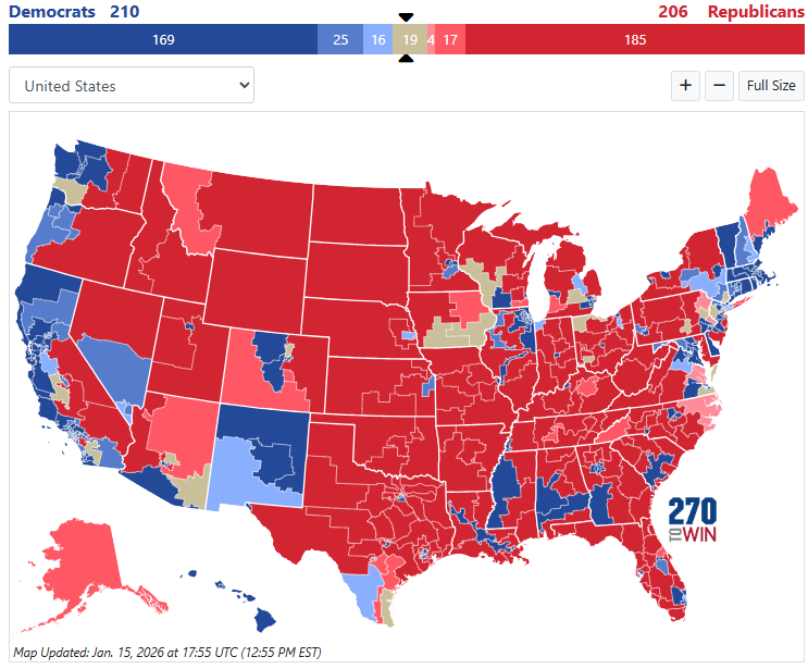 Additional court action, including a possible Supreme Court ruling that further weakens the Voting Rights Act, could disrupt even more maps and prolong instability. Current projections reflect this volatility rather than a settled end state, as reflected in consensus modeling from 270 to Win.