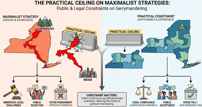 That public sentiment places a practical ceiling on maximalist strategies. Maps that cross the line from aggressive to absurd, such as a hypothetical New York district stretching from the Adirondacks to the Bronx, risk immediate legal challenges and public rejection. This constraint still matters because voters continue to punish perceived overreach.