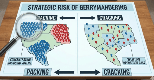 The strategic risk of gerrymandering lies in its two primary techniques: "cracking" and "packing." Packing concentrates the opposing party's voters into a few unassailable districts, conceding those seats to win more elsewhere. Cracking splits the opposition's base across many districts so they cannot form a majority in any of them.