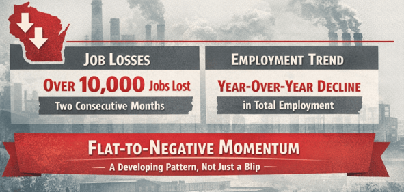 Wisconsin’s January 2026 economic update from the Department of Revenue describes a recent period of flat-to-negative momentum, including two consecutive months with job declines over 10,000 and a year-over-year decline in total employment. That is the important context because it frames the current moment as more than a one-month blip. It suggests a pattern.