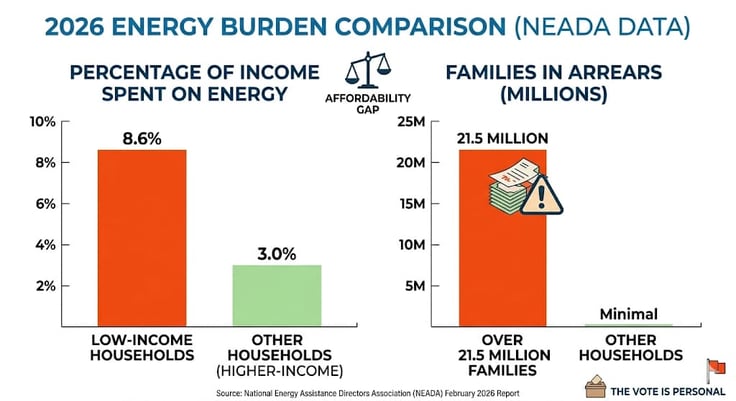 The National Energy Assistance Directors Association put the household-level damage in concrete terms in its February 2026 report: energy now consumes 8.6% of low-income household income, nearly 3 times the 3.0% burden carried by other households. When 21.5 million families are behind on power bills, that is not an abstraction. It is a message with a street address and a voting precinct attached.