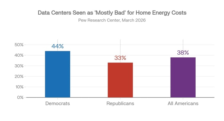As AI infrastructure expanded rapidly across Northern Virginia, Central Texas, Arizona, and the Carolinas, utility rates in those corridors climbed and voters began connecting the dots. Data centers require electricity at an industrial scale, and when grid operators struggled to absorb surging demand, ratepayers absorbed the cost instead. The Brookings Institution analysis found that a 2026 Politico national survey showed nearly half of all Americans expect data center energy costs to be a defining campaign issue this cycle, and Pew Research Center confirmed that 44% of Democrats and 33% of Republicans now view data center expansion as "mostly bad" for their home energy expenses.