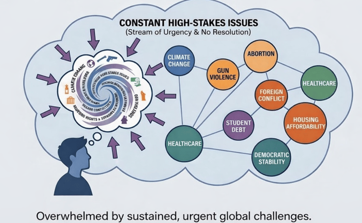 Campaigns frequently respond by aggregating these concerns rather than prioritizing among them. While this approach is intended to convey moral seriousness, it often produces the opposite effect. When every issue is presented as equally critical, voters struggle to identify achievable goals or pathways to impact. Research cited by the American Psychological Association on political burnout suggests that prolonged exposure to crisis-oriented messaging increases stress and disengagement, particularly when individuals perceive limited agency over outcomes.